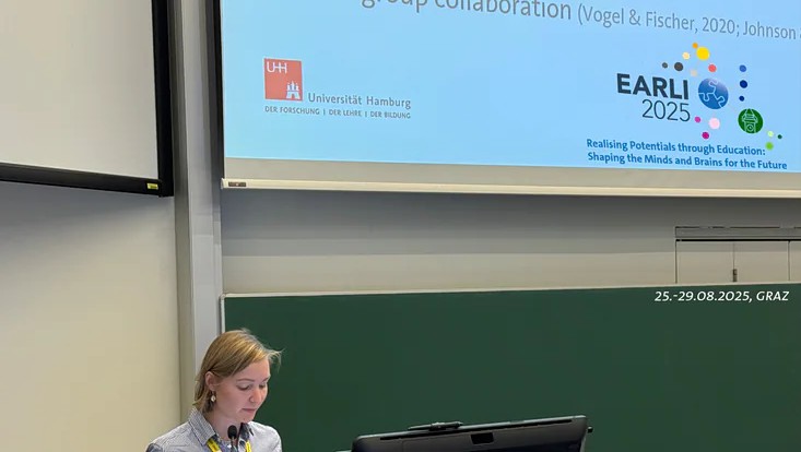 Während Freydis Vogel diverse Sessions organisierte, päsentierte Sebastian Tews Ergebnisse zur Fähigkeit video-basierten kollaborativen diagnostischen Denkens und Vorgehens (Collaborative Diagnostic Reasoning (CDR)) von angehenden Lehrkräften im Rahmen der Postersession "Teaching practices in different domains and settings". Auf die anregenden Gespräche innerhalb der Postersession folgten unteranderem Gespräche zu künftigen internationalen Forschungskollaborationen. Maya Persico präsentierte erstmals ihr internationales Kollaborationsprojekt mit Forschenden der Indiana University Bloomingten (USA) und Freydis Vogel von der Universität Hamburg. Die Präsentation ihrer Forschung zum Thema "The use of generative AI in collaborative learning: A scoping review" reihte sich hervorragend zwischen drei weiteren Beiträgen in das Symposium "The use of generative AI models in learning and instruction: A collection of systematic reviews" von Freydis Vogel und Cindy Hmelo-Silver ein. Trotz der frühen Uhrzeit am Mittwochmorgen war der Saal gut gefüllt. Die Präsentationsfolien wurden mehrfach angefragt und es folgten vertiefende Gespräche im Anschluss auf das Symposium.