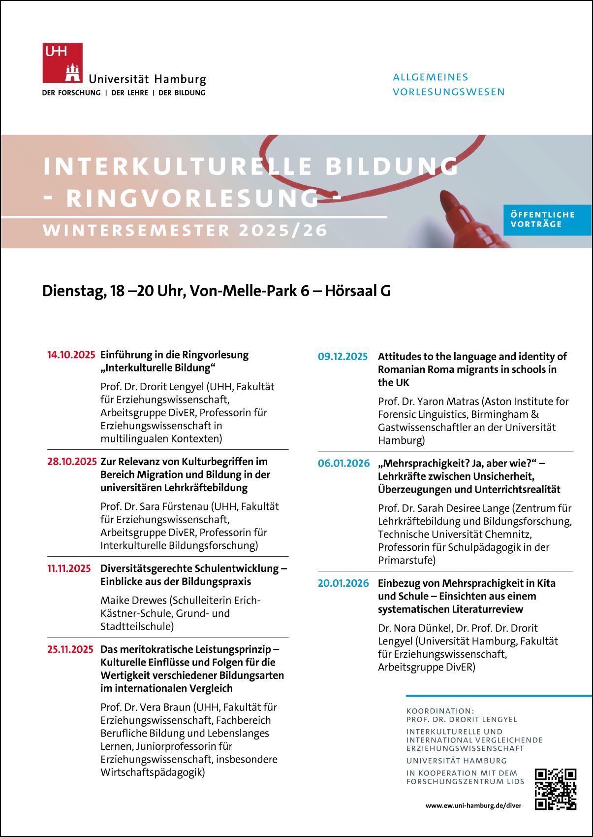 Seit den 1980er Jahren richtet sich die Ringvorlesung „Interkulturelle Bildung“ in jedem Wintersemester an Studierende und an die Öffentlichkeit. In Mittelpunkt stehen Fragen der Erziehung und Bildung in einer Gesellschaft, die von migrationsbedingter Diversität ge-prägt ist und sich durch eine Pluralität an sozialen, kulturellen und sprachlichen Lebens-formen auszeichnet, zugleich aber auch Rassismus und Diskriminierung hervorbringt. Vor-tragende aus verschiedenen Disziplinen und Institutionen geben Einblicke in konzeptionelle Entwicklungen, in eigene Forschung und pädagogische Praxis. Die ersten drei eingeladenen Vorträge gehen jeweils spezifischen Fragen nach, der Frage nach der Rolle und zum Um-gang mit Kulturbegriffen in der erziehungswissenschaftlichen Migrationsforschung, der Frage danach, welchen Einfluss verschiedene Verständnisse vom „Leistungsprinzip“ auf die Beurteilung von Bildungsarten haben oder auch der Frage, wie diversitätssensible Schul-entwicklung gelingen kann. Der Schwerpunkt der letzten drei Vorträge liegt dann auf Fra-gen der Mehrsprachigkeit und sprachlichen Bildung in unterschiedlichen Konstellationen und Institutionen.