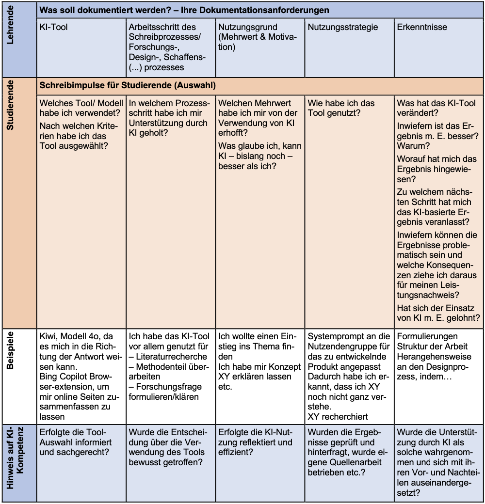 | Reflexionsorientierte Dokumentation I: Erkenntnismatrix für den KI-Kompetenzerwerb | Dokumentationsanforderungen werden gezielt festgelegt und in Form von Fragen an Studierende vermittelt | Dokumentationszwecke und Anforderungen werden spezifisch angepasst (Lehrende) | Planungsaufwand im Vorfeld (Lehrende) |