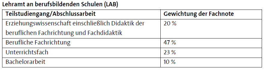 Das Bachelorstudium für das Lehramt an berufsbildenden Schulen (LAB) umfasst den Teilstudiengang Erziehungswissenschaft einschließlich der Didaktik der beruflichen Fachrichtung sowie der Fachdidaktik des Unterrichtsfaches (35 LP), eine berufliche Fachrichtung (84 LP) sowie ein weiteres Unterrichtsfach als Teilstudiengang (42 LP).