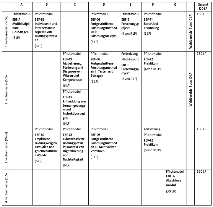 Die Module im Masterstudiengang Empirische Bildungsforschung verteilen sich wie in der folgenden Tabelle dargestellt auf die Fachsemester: