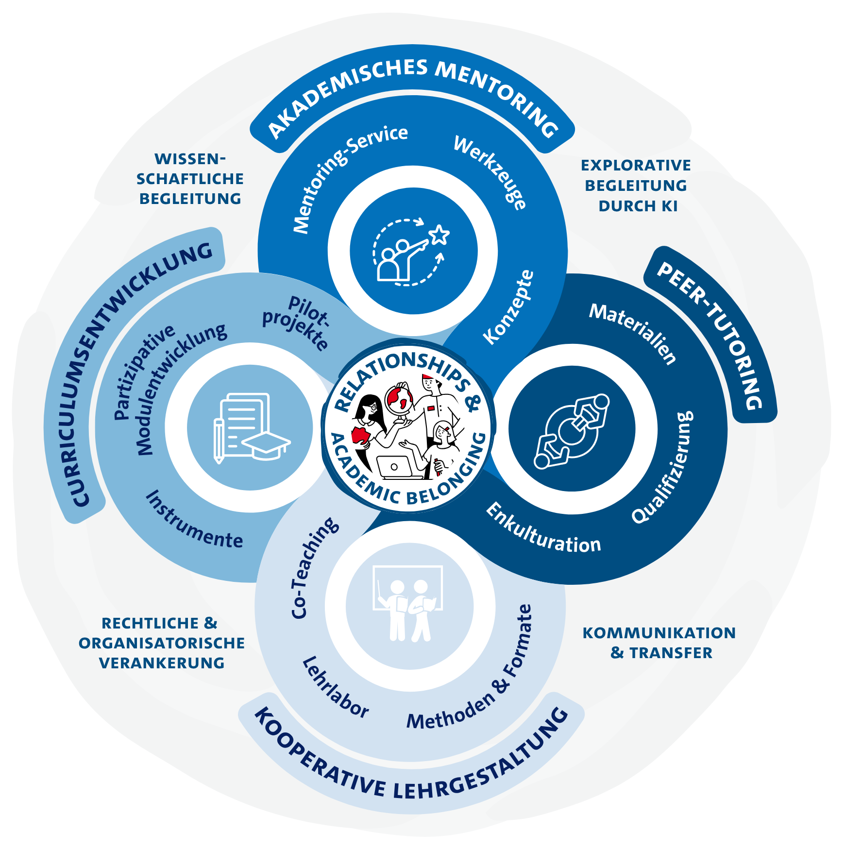Im Zentrum steht die Stärkung der Qualität akademischer Beziehungen und des Erlebens von Zugehörigkeit im Studium. Dazu bündelt das Projekt vier thematische Schwerpunkte: